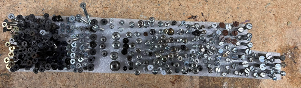If you have a bunch of screws laying around, find a piece of foam and screw them in to that. Not only is it a satisfying project, it will help you find the exact one you need when you're in too much of a hurry to empty out that mason jar full of screws to sort through and hopefully find your screw.