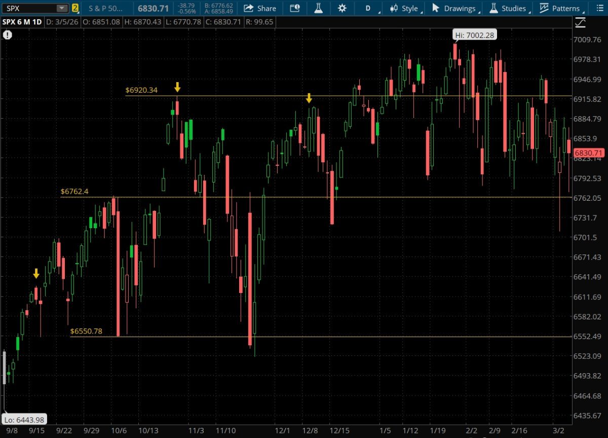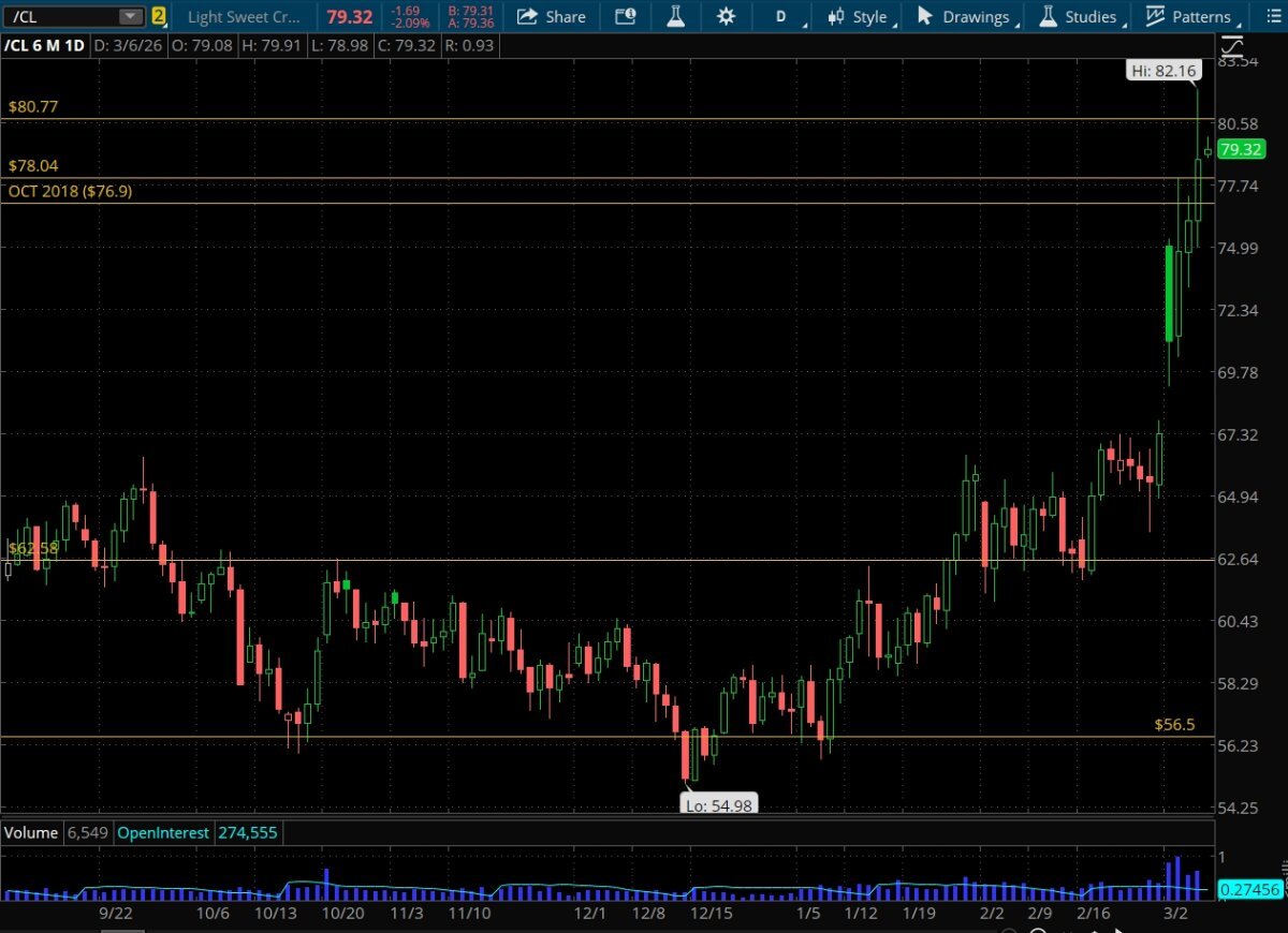The S&P is holding up pretty well considering what's going on. More concerned with the 6762 level that, if breeched, would take us back into the channel from the huge sell-off in October, which puts 6550 in play as the next stop. Incoming chart porn warning. Reminder, the yellow arrows were Fed rate cuts. On to the story of the day - energy, and the price of crude. It was fun to watch today. Got as high as $82.16. Little under $80 as I type this. For perspective, a 6 month chart of crude and what it looks like in the last week. This isn't new, when you look back in history - given the price of crude right now. There are some parallels. Look around Jan 15, and later what they call the 12 day war. Blowing **** up is directly proportional to the price of crude it appears. There is an old saying. This time is different. Seems like some **** is getting blown up. Next stop according to the charts is around 92.
