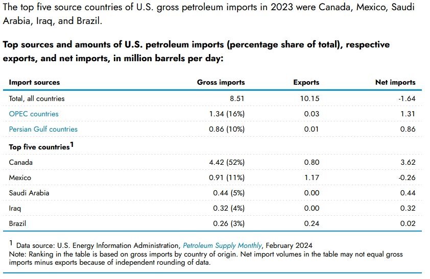 What we don't produce ourself we import. From 2023, but probably not much different today; When oil prices didn't go nuts today I thought about the above. The straight doesn't mean much to us. But at the same time, Brent crude, which will have a bigger impact on that part of the world, didn't go nuts either. Most of Iran's oil goes to China, which is probably why the straight is still open (there are reports this isn't true as well). You need money to fight a war, and oil is money. You can't print it either. :-)