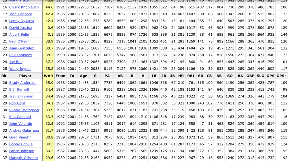 It could also be said that we ended up trading Travis Fryman for the dead-end career of Willie Blair. Fryman could also be considered one of the lowest-profile, least-remembered 30+-win guys who played their entire careers between 1985 and 2005. Here’s a list of the guys around him in WAR.
