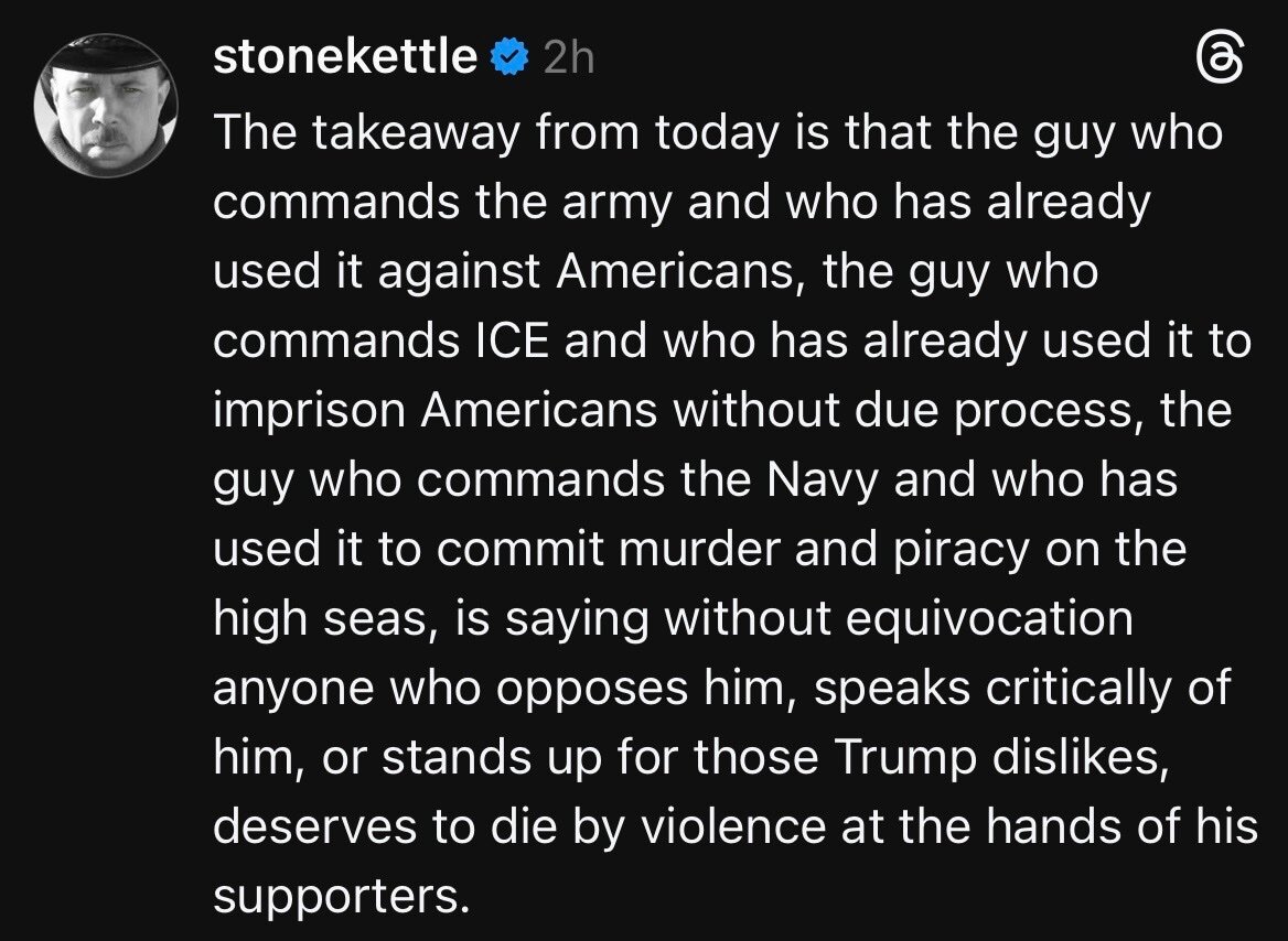 chasfh Posted 7 hours ago Posted 7 hours ago 33 minutes ago, Motown Bombers said: Let's be clear on what's happening here: Donald Trump is President of the United States of America, something which he is 24 hours a day, seven days a week, and from which there is no break. That's just the way the job goes, and nothing he says while president can be regarded as reflecting his personal point of view irrespective of that—and that goes double for when he is speaking from the White House. Therefore, what Trump posted, and what he is saying here, reflects the official position of the United States government on Rob Reiner. Quote