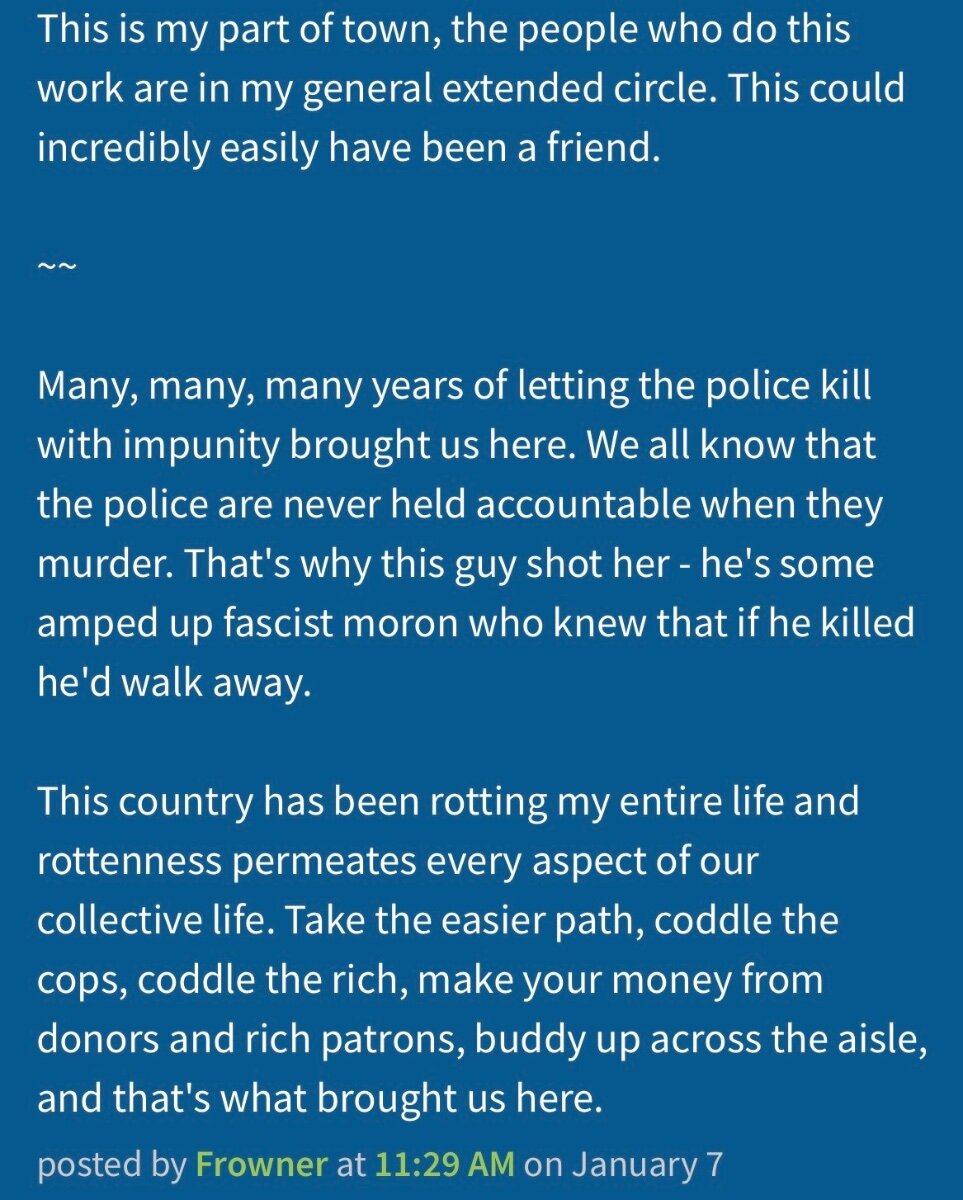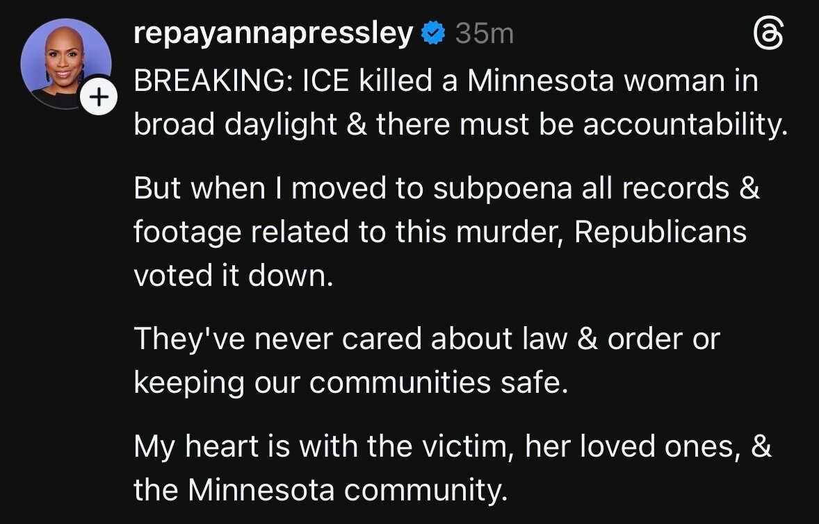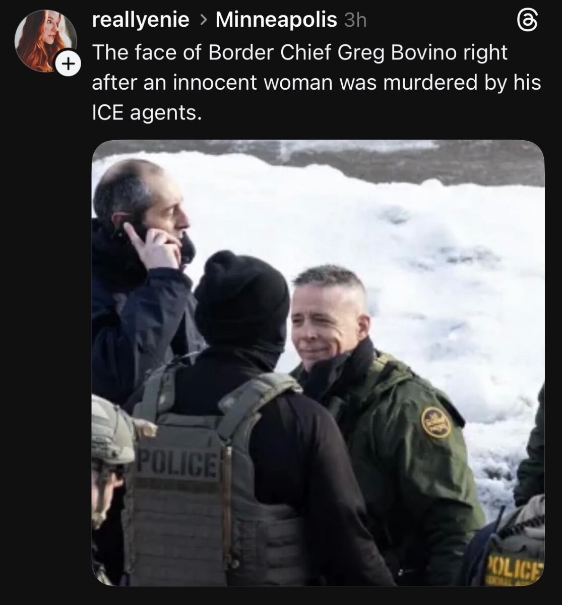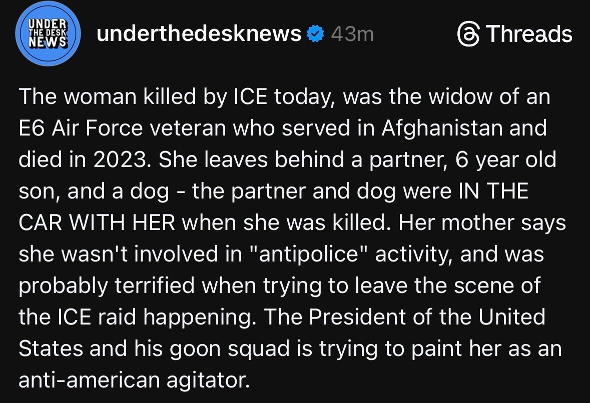 mtutiger Posted yesterday at 12:25 AM Posted yesterday at 12:25 AM (edited) 1 hour ago, Edman85 said: Probably had her foot on the break and lost control when she was shot because her body wasn't functioning anymore. Even beyond that, the Department of Homeland Security Secretary, speaking on behalf of an administration that is supposed to represent all Americans, called this 37 year old mom a "domestic terrorist". This administration lies and defames and circles the wagons every single chance they get. Even when they commit murder. There is no defense here... this woman should still be alive, and they all know it. Edited yesterday at 12:35 AM by mtutiger Quote