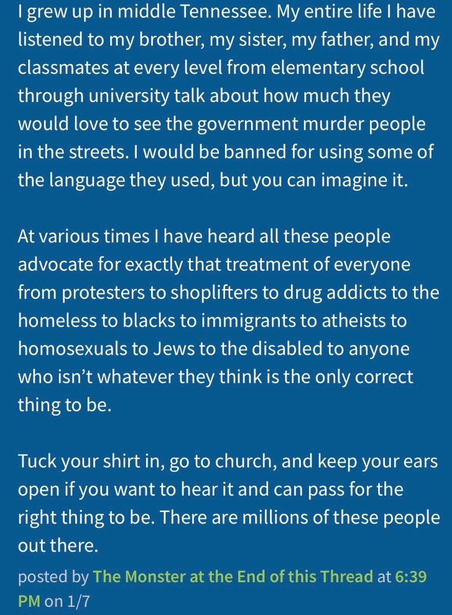 chasfh Posted Wednesday at 11:33 PM Posted Wednesday at 11:33 PM 45 minutes ago, Tigerbomb13 said: Then it feels like there’s always a new low, and who knows where the bottom is. One day it’s threatening to overtake multiple sovereign nations, the next days it’s a a woman shot in the head 3-4 times by ICE while turning her car around (while they deny her any medical care). What will tomorrow bring? And so many people cheer these things that would have been thought to be unthinkable a decade ago. I have aunts, uncles, and cousins that are on the side of that, and I don’t know how to reconcile that. I remember watching video of a network news report that aired a day or two after the Kent State shootings—it might have been part of some documentary I saw—where they interviewed Joe and Jane Public on the street about what they thought of what happened there, and a frightening number of them said that the kids deserved to be shot, and one of them said they should have shot more kids, that'll teach them to use college to dodge their sacred military duty, or something along those lines. That's where these present-day degenerate boomer and gen x jagoffs learned to cheer for that kind of thing: from their degenerate "greatest generation" parents. Quote