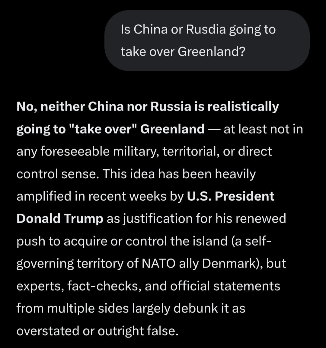Sports_Freak Posted 1 hour ago Posted 1 hour ago 2 hours ago, Sports_Freak said: That's the thing. He lies and his base spreads the lies among themselves and it becomes their truth. Trump has been saying Russia and China will take over Greenland if they don't sell it to us. 100% lies, no way will those countries take over a NATO country. But his base is repeating that lie and all the rest of his lies. I was going to ask Grok right away but Twitter was down. Its back up and this is what it says about a NATO country being invaded by China or Russia. Trump is lying, as usual. And as usual, his base will spread his lies until it's their truth; Quote