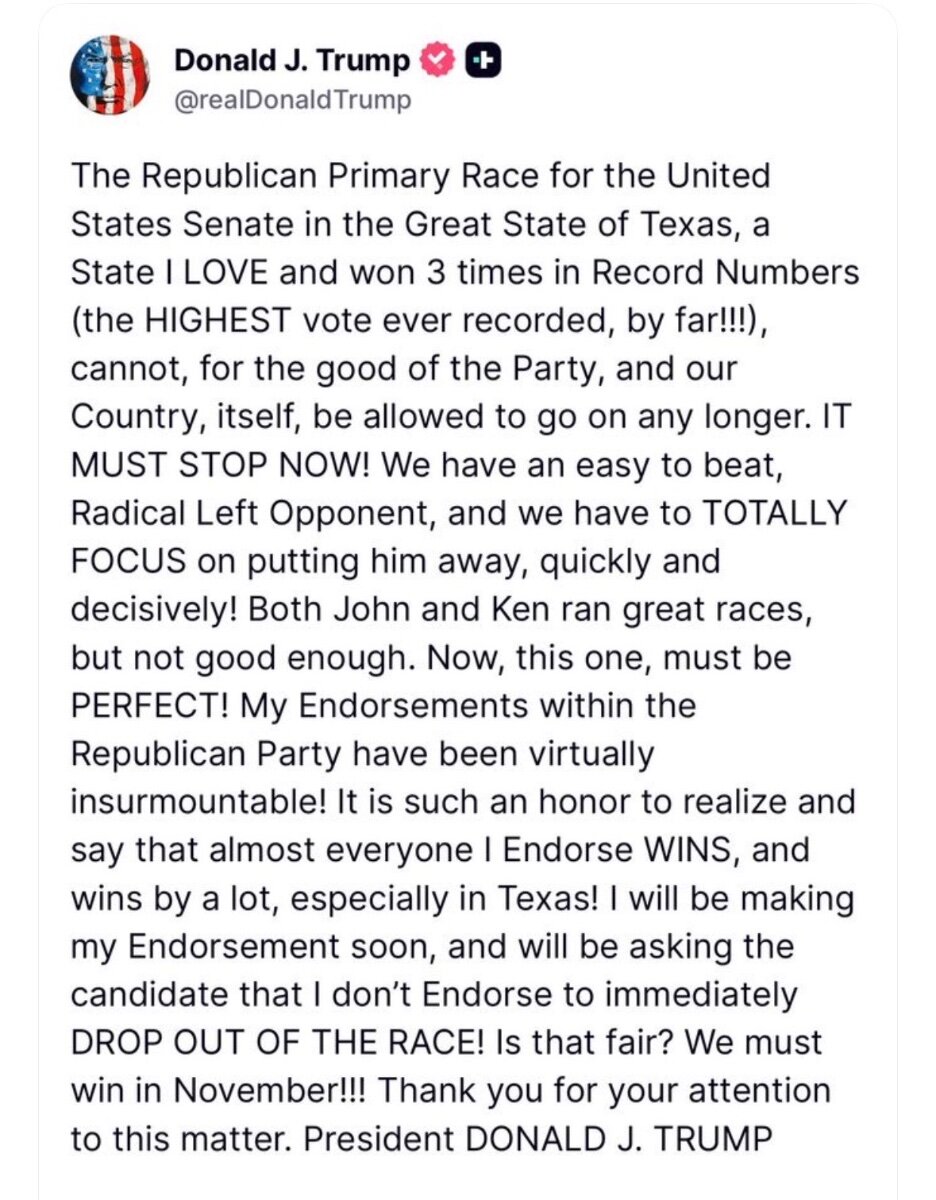 gehringer_2 Posted 58 minutes ago Posted 58 minutes ago 5 minutes ago, Mr.TaterSalad said: If this post is real then please endorse Ken Paxton, please endorse Ken Paxton, please endorse Ken Paxton! James Talarico is likely going to lose either way, Cornyn or Paxton. But I think he has ZERO chance against Cornyn. I'd say he has a 15-20-25% maybe against a nut like Paxton. He's the male version of Sharon Angle or Kari Lake. Trump is triangulating for leverage to get Cornyn's support (or at least avoid losing it) for the rest of year. Quote