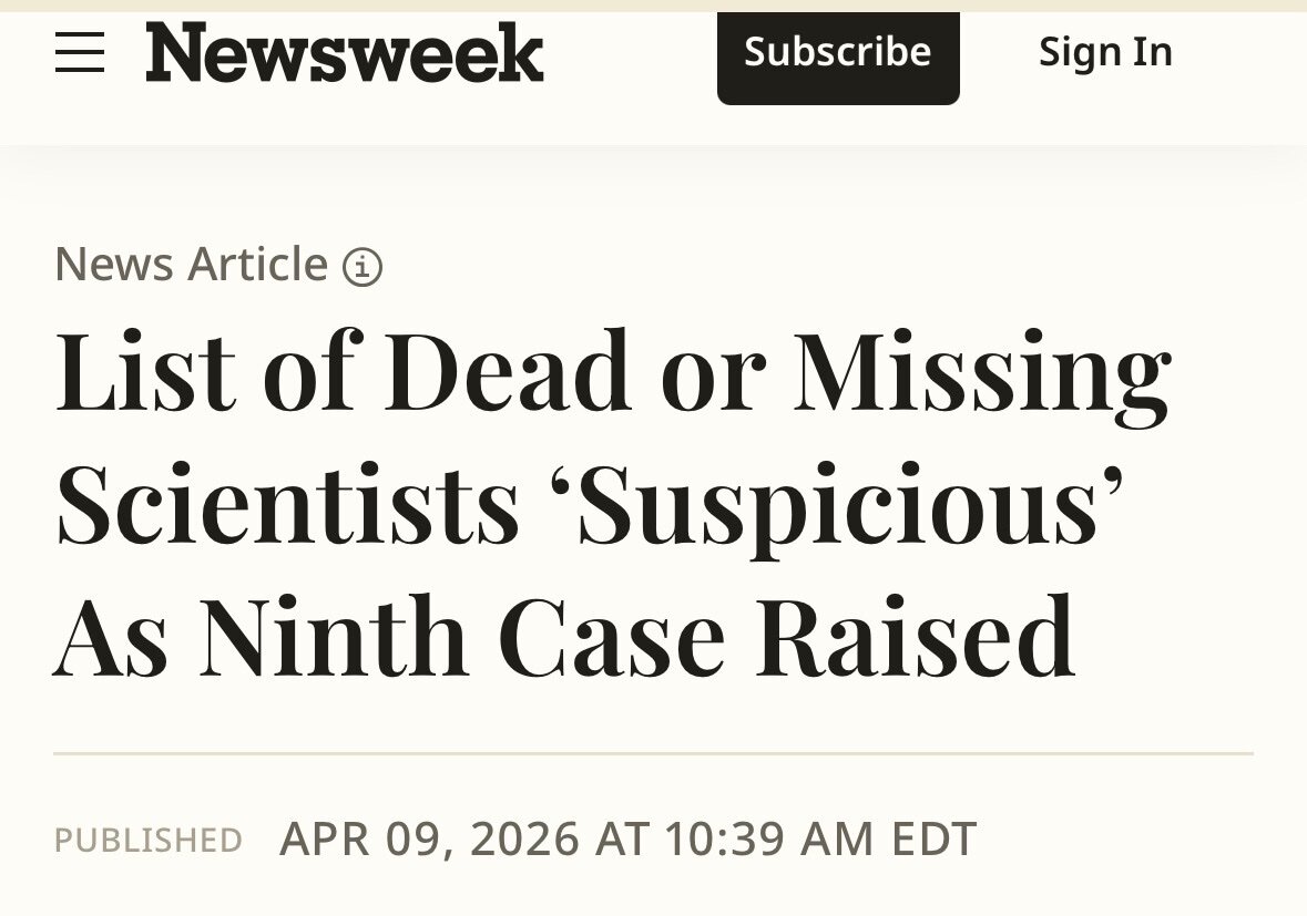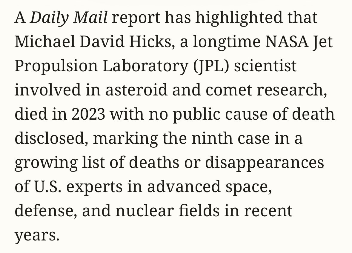guy incognito Posted 2 minutes ago Posted 2 minutes ago (edited) Huh. https://www.newsweek.com/list-dead-or-missing-scientists-suspicious-michael-david-hicks-11805585 Edited 1 minute ago by guy incognito Quote