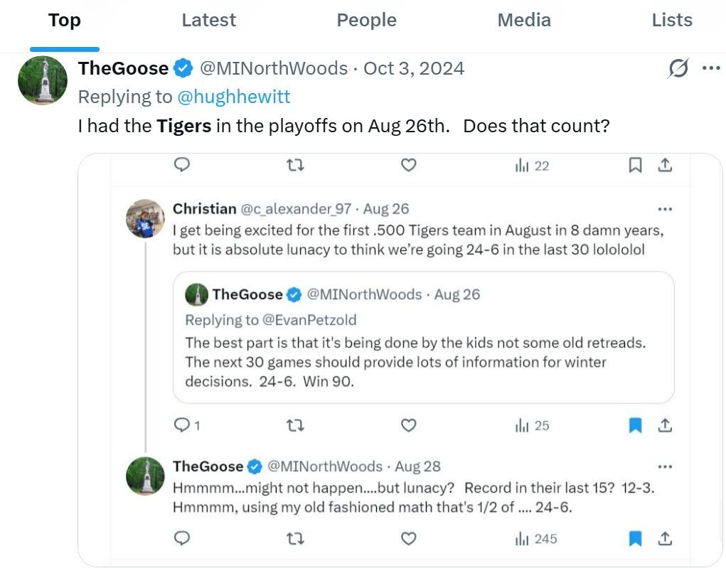 NorthWoods Posted 10 minutes ago Posted 10 minutes ago 2 hours ago, Tiger337 said: But the biggest deal he made was trading Flaherty and now he's brought him back two times Strategery.....he's playing chess.. And some of us saw '24 coming long before others, I provide evidence from my Twitter account: 1 Quote