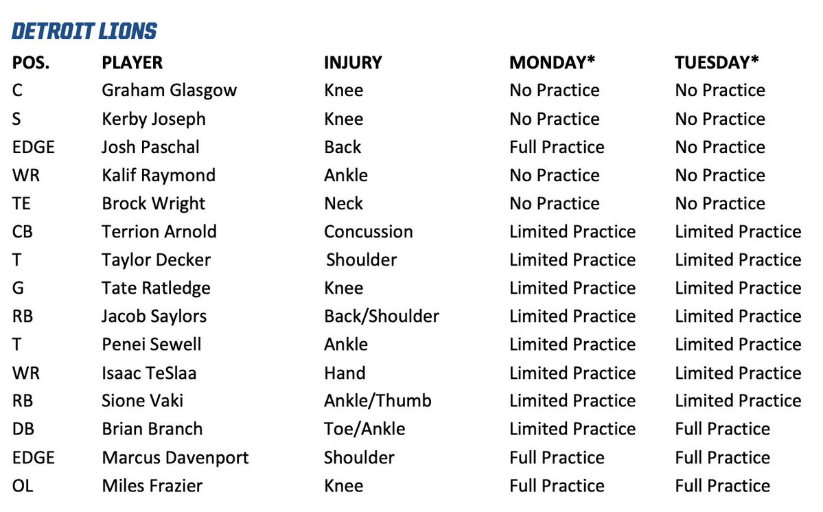 MichiganCardinal Posted 7 hours ago Author Posted 7 hours ago These are estimates, the Lions are only doing walkthroughs, but not a good report even by recent standards. Paschal's evaluation clock is up tomorrow, he has to either be activated or shut down for the season. Going from FP to NP in consecutive walkthroughs may indicate they are shutting him down. Also not looking good for Glasgow, Raymond, or Wright. Would like to see Arnold go FP tomorrow in indication that he's good for Thursday. Campbell already said Kerby was a no-go again this week, will make six straight. Next man up at TE would be TE4 Ross Dwelly. They have two TEs on the practice squad right now too, Anthony Firkser and Zach Horton. More likely they would roll with Skipper as a jumbo set OT again. Quote