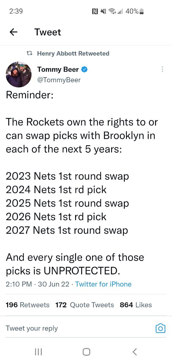 Deleterious Posted June 30, 2022 Author Posted June 30, 2022 Durant is an interesting situation. A player of his caliber be available with 4 years left on his contract and without a no trade clause. Not sure we have ever had this happen. NJ can deal him anywhere and he has almost no say other than threatening not to play. But he misses out on 4 years and $50M a year doing that. Quote
