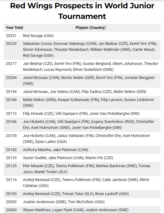 lordstanley Posted January 14, 2023 Posted January 14, 2023 (edited) https://detroithockeynow.com/2023/01/09/should-red-wings-fans-be-concerned-about-the-yzerplan/ Duff apparently hasn't caught on that Raymond has been on fire since December 1, but otherwise, I get some of his points. Not sure if spots on world juniors teams are the best indicator, sometimes it comes to timing and country depth, but I'd rather have more than less. Still, the Wings had 9 last year, so let's not overreact. And there was one. One Detroit Red Wings prospect in the recently-completed IIHF World Junior Championship. Forward Red Savage of the NCAA Miami Redhawks, a 2021 Detroit draftee, won a bronze medal with the USA. A year after a record nine Red Wings draft picks were skating in the tournament, Savage was alone on the world junior stage in terms of representing Detroit’s future. And that should definitely be cause for concern. Edited January 14, 2023 by lordstanley Quote